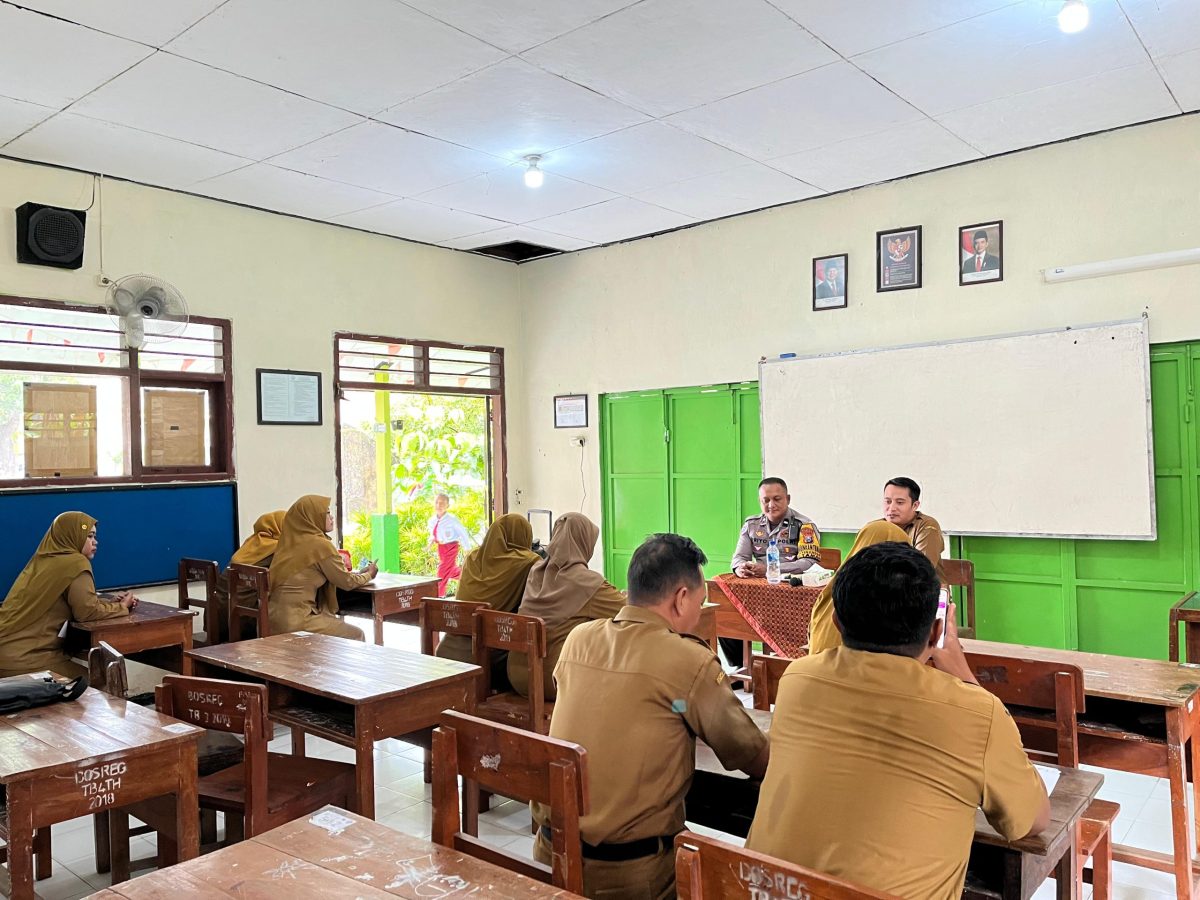 Bhabinkamtibmas Polsek Taman Desa Tanjungsari, Aipda Dwi Priyo, melaksanakan kegiatan sosialisasi dan pemberian himbauan kepada guru dan pelajar di SDN 2 Tanjungsari, Senin (12/01/2026).